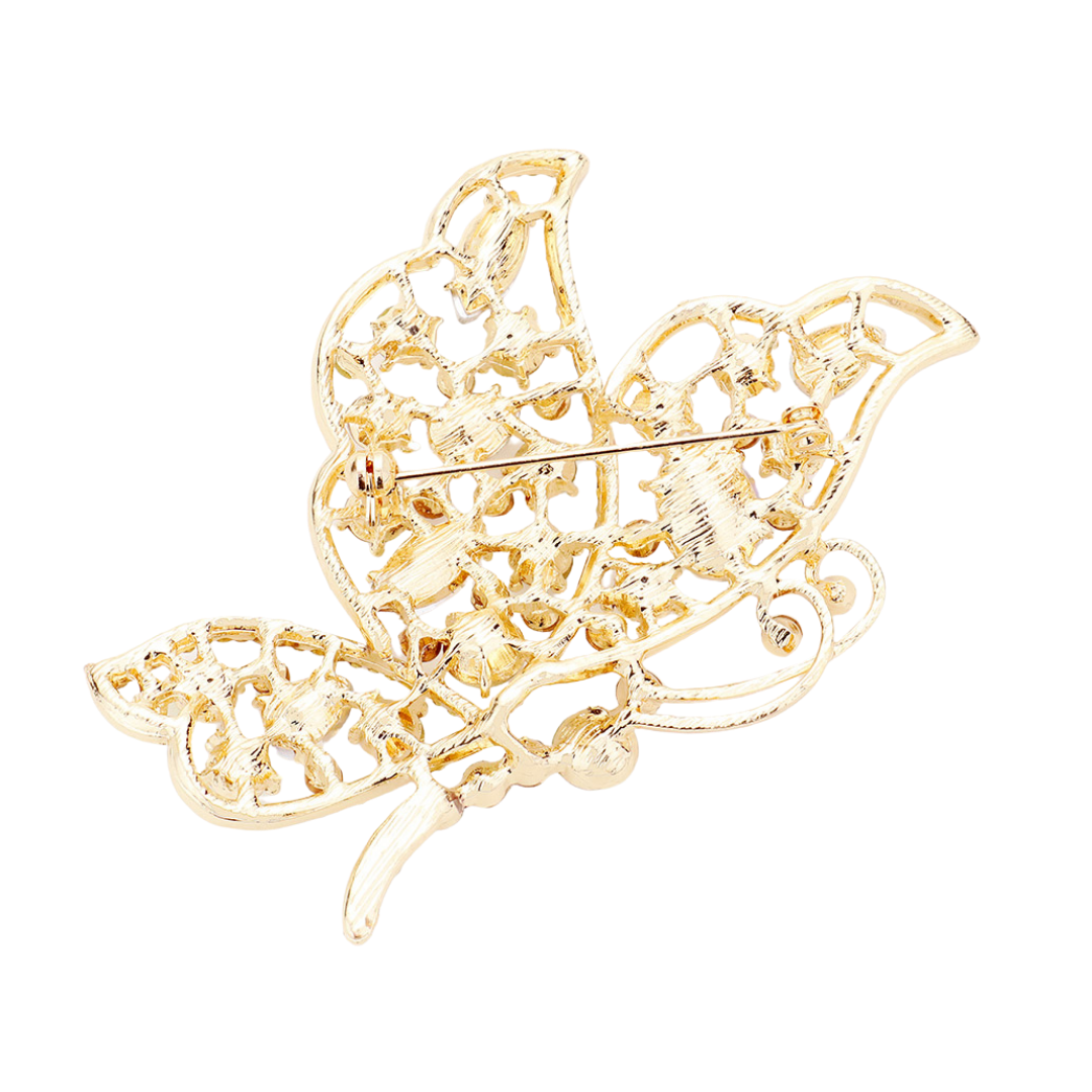 Multi color butterfly bling brooch with gold trim.