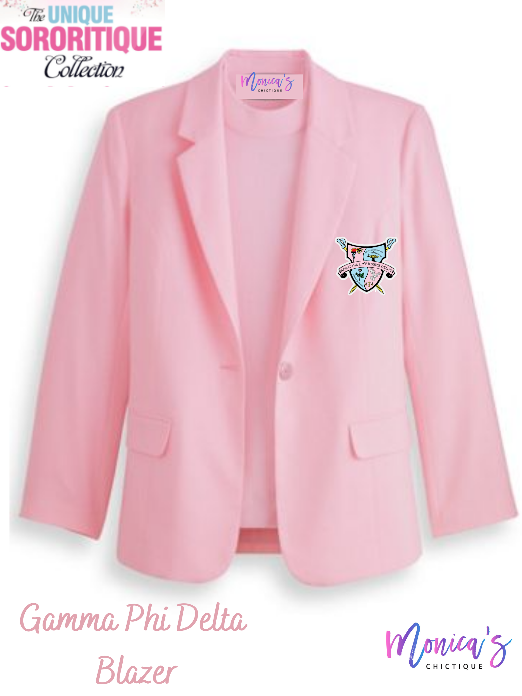 Gamma Phi Delta baby pink blazer with shield (sew on patch). This classic style blazer is made of woven polyester and is tailored, soft, stylish and warm. Blazer is fully lined with shoulder pads, front and back princess seams, and faux pockets. We recommend special care instructions due to the patch. Note: Shirt is not included with the blazer.