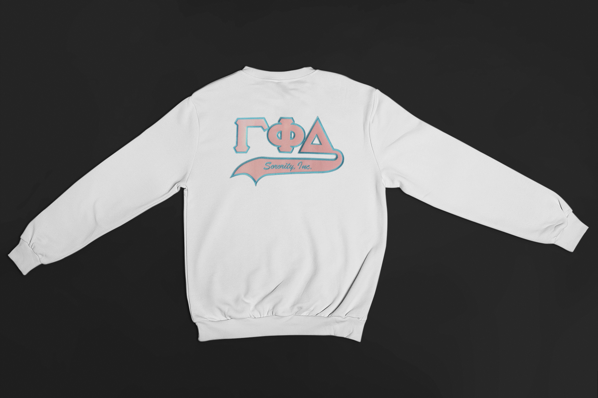 Gamma Phi Delta Sorority, Inc. sweatshirt with pink applique letters. Sweatshirt sizes are unisex. Please note that pink applique letters are slightly smaller than photo image.