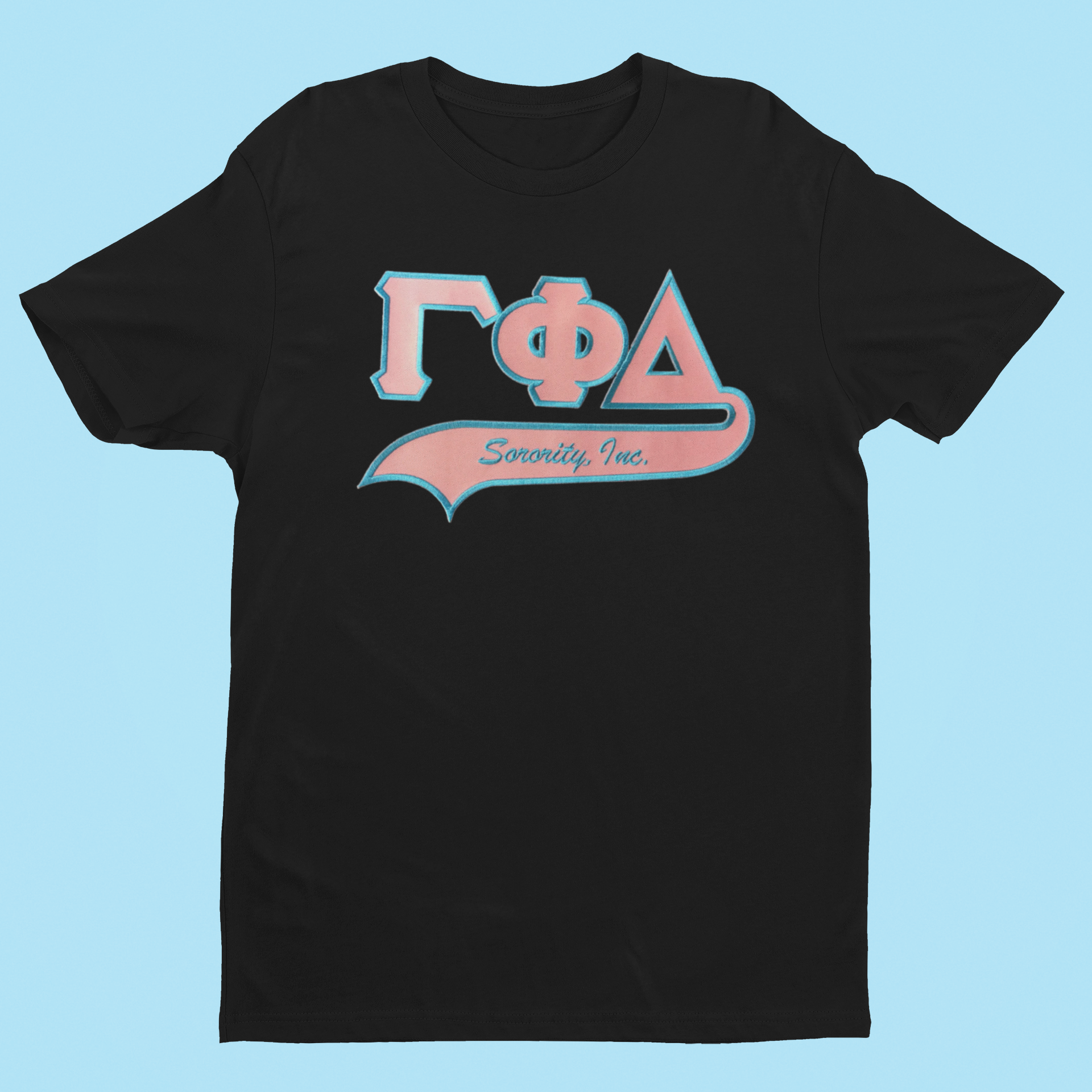 Gamma Phi Delta Sorority, Inc. t-shirt with pink applique letters trimmed in light blue. Please note that pink applique letters are slightly smaller than photo image. Please note and be mindful...