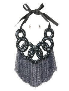 Navy beaded rings with navy metal fringe. Statement necklace ties in the back and adjusts to desired length.