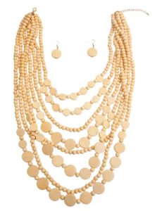 Light neutral color layered (8 strands) wooden beads necklace with earrings.  Beads are a lightweight feel.