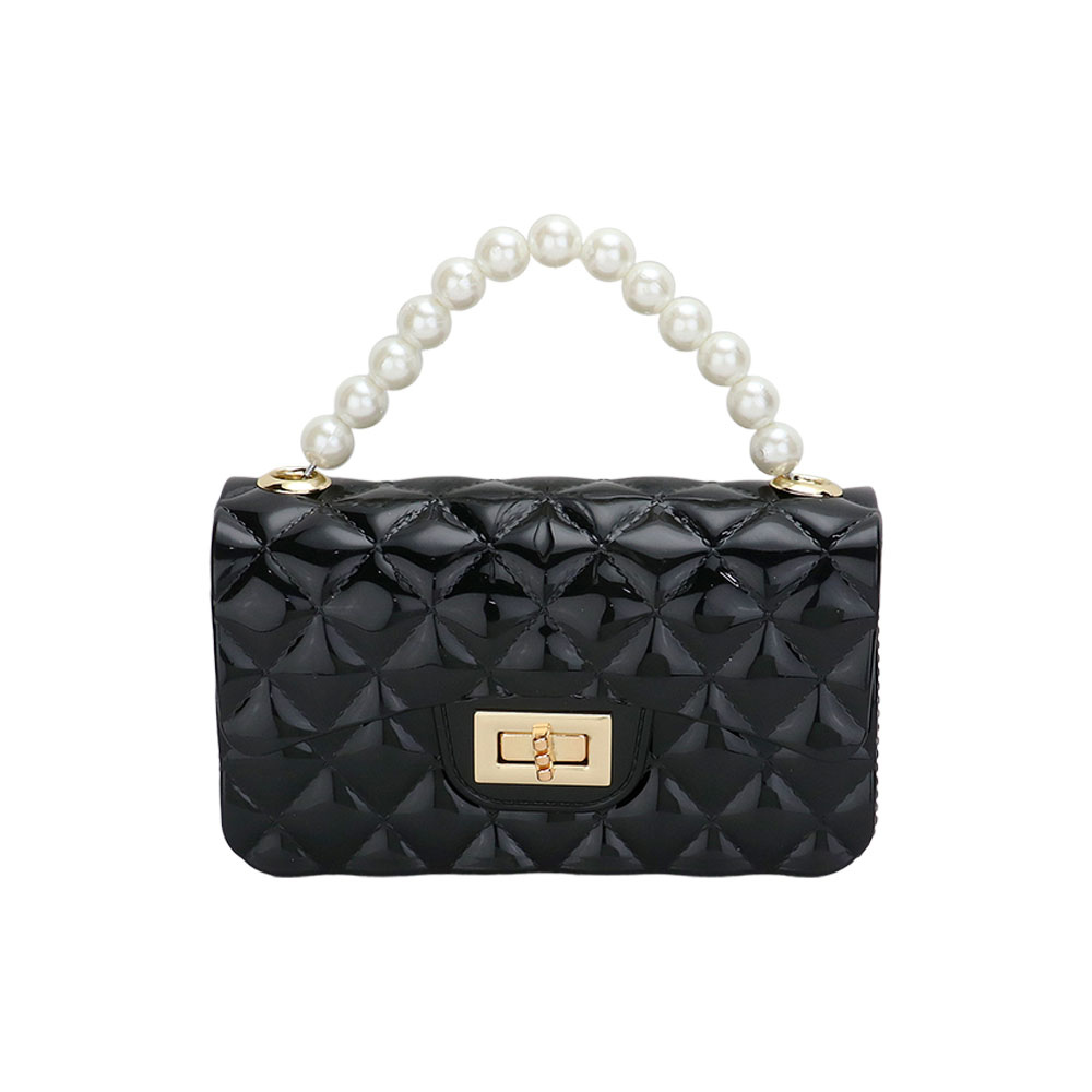Small black quilted crossbody bag with pearl top handle and clasp closure. This clutch can be styled with or without chain.